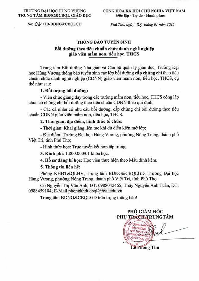 Trung tâm BDNG&CBQLGD Trường Đại học Hùng Vương tuyển sinh các lớp Bồi dưỡng theo tiêu chuẩn CDNN giáo viên MN, TH, THCS năm 2025